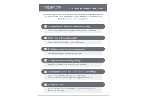 You may wonder, how do I move people with potential from group member to apprentice to leader? This sheet outlines basic steps and key questions to be proactive in investing in potential leaders.